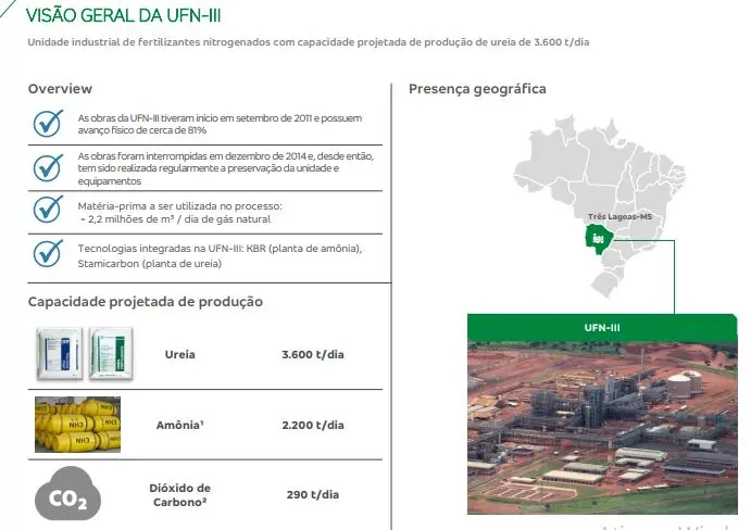 A UFN-3 terá capacidade para produzir cerca de 3.600 toneladas diárias de ureia e 2.200 toneladas de amônia. Desse volume, aproximadamente 180 toneladas de amônia serão excedentes e destinadas à comercialização.