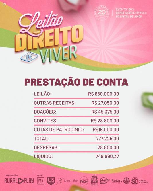 O resultado impressiona. O evento fechou com R$ 749.990,37 líquidos destinados à instituição, a partir de uma arrecadação bruta de R$ 777.225,00, formada por lances, doações espontâneas, convites, cotas de patrocínio e outras contribuições. Mais do que um número expressivo, o valor simboliza o poder de mobilização de uma comunidade que entende que cuidar do outro é uma responsabilidade coletiva.